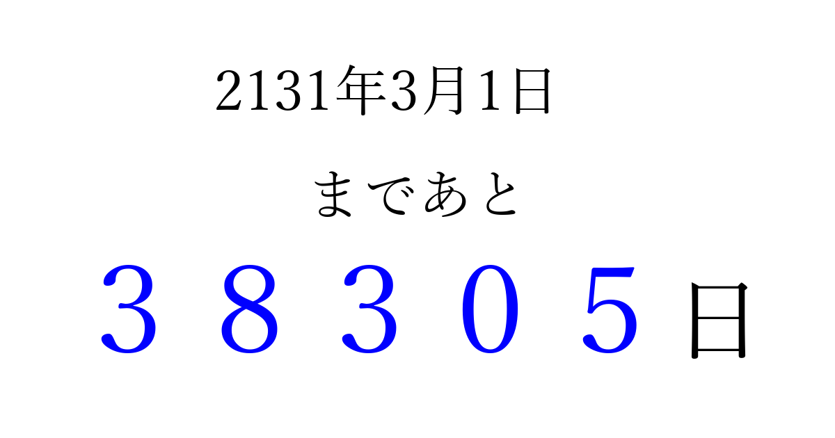 2131年3月1日(木)まで あと 99999 日です 追加すると、トップページからすぐ選べるようになります ※2026/04/15現在の結果です。 最新の状態に更新する ↓シェアして、タイムライン上にカウントダウンを表示しよう!↓ 📤 この結果を共有する Tweet シェア Threads Bluesky 別の日付でカウントダウン 2131年3月のカレンダー このページをブックマークに追加すると、いつでもカウントダウンを確認できます。 (PC: Ctrl+D / Mac: ⌘+D) hitome-notes.comでは以下のページも運営しています。 指定日と期間から日付を計算 | ガチャ確率計算・シミュレーション | プライバシー・ポリシー 運営者:Avocado