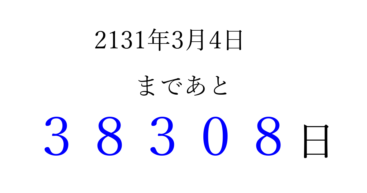 2131年3月4日(日)まで あと 99999 日です 追加すると、トップページからすぐ選べるようになります ※2026/04/15現在の結果です。 最新の状態に更新する ↓シェアして、タイムライン上にカウントダウンを表示しよう!↓ 📤 この結果を共有する Tweet シェア Threads Bluesky 別の日付でカウントダウン 2131年3月のカレンダー このページをブックマークに追加すると、いつでもカウントダウンを確認できます。 (PC: Ctrl+D / Mac: ⌘+D) hitome-notes.comでは以下のページも運営しています。 指定日と期間から日付を計算 | ガチャ確率計算・シミュレーション | プライバシー・ポリシー 運営者:Avocado