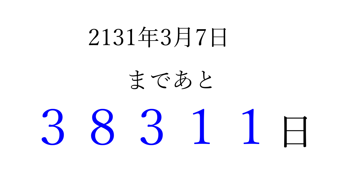 2131年3月7日(水)まで あと 99999 日です 追加すると、トップページからすぐ選べるようになります ※2026/04/15現在の結果です。 最新の状態に更新する ↓シェアして、タイムライン上にカウントダウンを表示しよう!↓ 📤 この結果を共有する Tweet シェア Threads Bluesky 別の日付でカウントダウン 2131年3月のカレンダー このページをブックマークに追加すると、いつでもカウントダウンを確認できます。 (PC: Ctrl+D / Mac: ⌘+D) hitome-notes.comでは以下のページも運営しています。 指定日と期間から日付を計算 | ガチャ確率計算・シミュレーション | プライバシー・ポリシー 運営者:Avocado