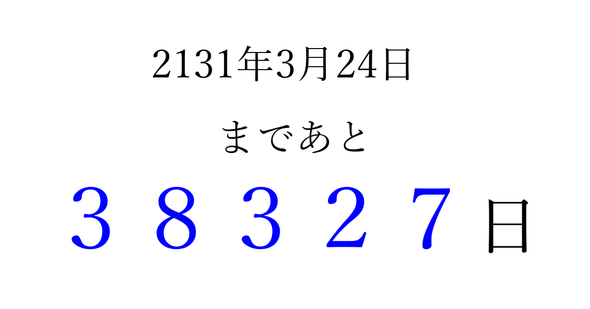 2131年3月24日(土)まで あと 99999 日です 追加すると、トップページからすぐ選べるようになります ※2026/04/16現在の結果です。 最新の状態に更新する ↓シェアして、タイムライン上にカウントダウンを表示しよう!↓ 📤 この結果を共有する Tweet シェア Threads Bluesky 別の日付でカウントダウン 2131年3月のカレンダー このページをブックマークに追加すると、いつでもカウントダウンを確認できます。 (PC: Ctrl+D / Mac: ⌘+D) hitome-notes.comでは以下のページも運営しています。 指定日と期間から日付を計算 | ガチャ確率計算・シミュレーション | プライバシー・ポリシー 運営者:Avocado