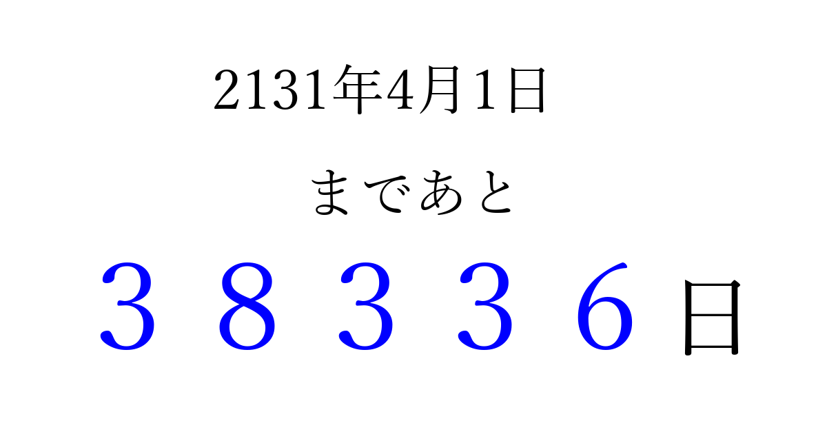 2131年4月1日(日)まで あと 99999 日です 追加すると、トップページからすぐ選べるようになります ※2026/04/15現在の結果です。 最新の状態に更新する ↓シェアして、タイムライン上にカウントダウンを表示しよう!↓ 📤 この結果を共有する Tweet シェア Threads Bluesky 別の日付でカウントダウン 2131年4月のカレンダー このページをブックマークに追加すると、いつでもカウントダウンを確認できます。 (PC: Ctrl+D / Mac: ⌘+D) hitome-notes.comでは以下のページも運営しています。 指定日と期間から日付を計算 | ガチャ確率計算・シミュレーション | プライバシー・ポリシー 運営者:Avocado