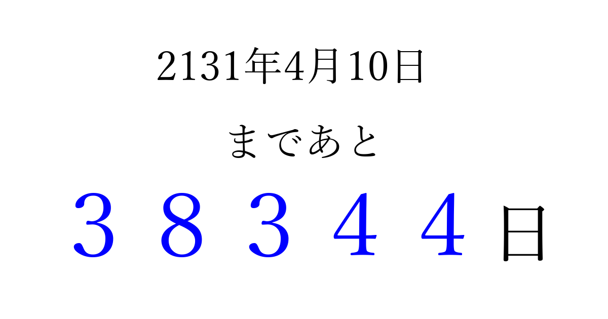 2131年4月10日(火)まで あと 99999 日です 追加すると、トップページからすぐ選べるようになります ※2026/04/16現在の結果です。 最新の状態に更新する ↓シェアして、タイムライン上にカウントダウンを表示しよう!↓ 📤 この結果を共有する Tweet シェア Threads Bluesky 別の日付でカウントダウン 2131年4月のカレンダー このページをブックマークに追加すると、いつでもカウントダウンを確認できます。 (PC: Ctrl+D / Mac: ⌘+D) hitome-notes.comでは以下のページも運営しています。 指定日と期間から日付を計算 | ガチャ確率計算・シミュレーション | プライバシー・ポリシー 運営者:Avocado