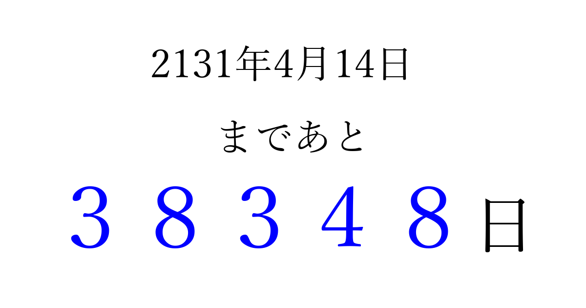 2131年4月14日(土)まで あと 99999 日です 追加すると、トップページからすぐ選べるようになります ※2026/04/16現在の結果です。 最新の状態に更新する ↓シェアして、タイムライン上にカウントダウンを表示しよう!↓ 📤 この結果を共有する Tweet シェア Threads Bluesky 別の日付でカウントダウン 2131年4月のカレンダー このページをブックマークに追加すると、いつでもカウントダウンを確認できます。 (PC: Ctrl+D / Mac: ⌘+D) hitome-notes.comでは以下のページも運営しています。 指定日と期間から日付を計算 | ガチャ確率計算・シミュレーション | プライバシー・ポリシー 運営者:Avocado