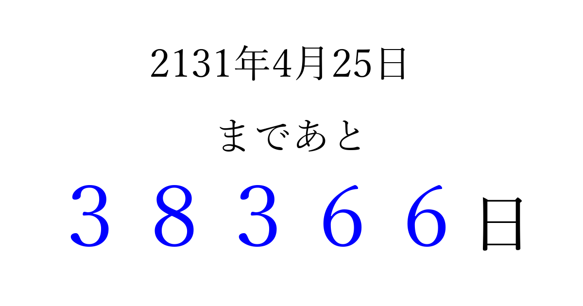 2131年4月25日(水)まで あと 99999 日です 追加すると、トップページからすぐ選べるようになります ※2026/04/09現在の結果です。 最新の状態に更新する ↓シェアして、タイムライン上にカウントダウンを表示しよう!↓ 📤 この結果を共有する Tweet シェア Threads Bluesky 別の日付でカウントダウン 2131年4月のカレンダー このページをブックマークに追加すると、いつでもカウントダウンを確認できます。 (PC: Ctrl+D / Mac: ⌘+D) hitome-notes.comでは以下のページも運営しています。 指定日と期間から日付を計算 | ガチャ確率計算・シミュレーション | プライバシー・ポリシー 運営者:Avocado