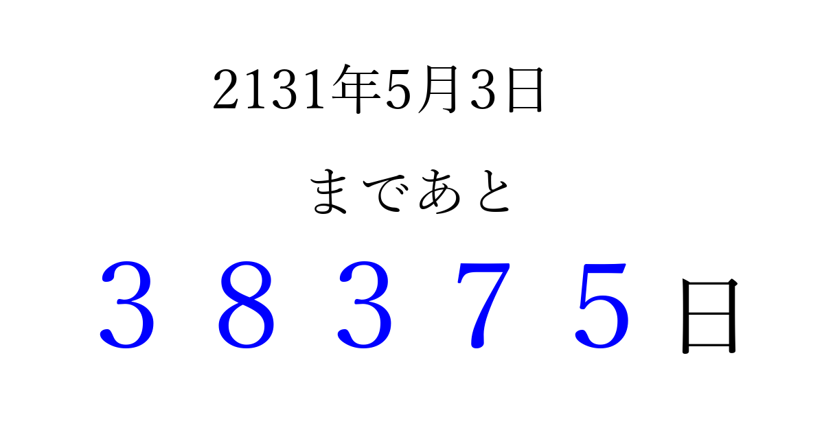 2131年5月3日(木)まで あと 99999 日です 追加すると、トップページからすぐ選べるようになります ※2026/04/08現在の結果です。 最新の状態に更新する ↓シェアして、タイムライン上にカウントダウンを表示しよう!↓ 📤 この結果を共有する Tweet シェア Threads Bluesky 別の日付でカウントダウン 2131年5月のカレンダー このページをブックマークに追加すると、いつでもカウントダウンを確認できます。 (PC: Ctrl+D / Mac: ⌘+D) hitome-notes.comでは以下のページも運営しています。 指定日と期間から日付を計算 | ガチャ確率計算・シミュレーション | プライバシー・ポリシー 運営者:Avocado