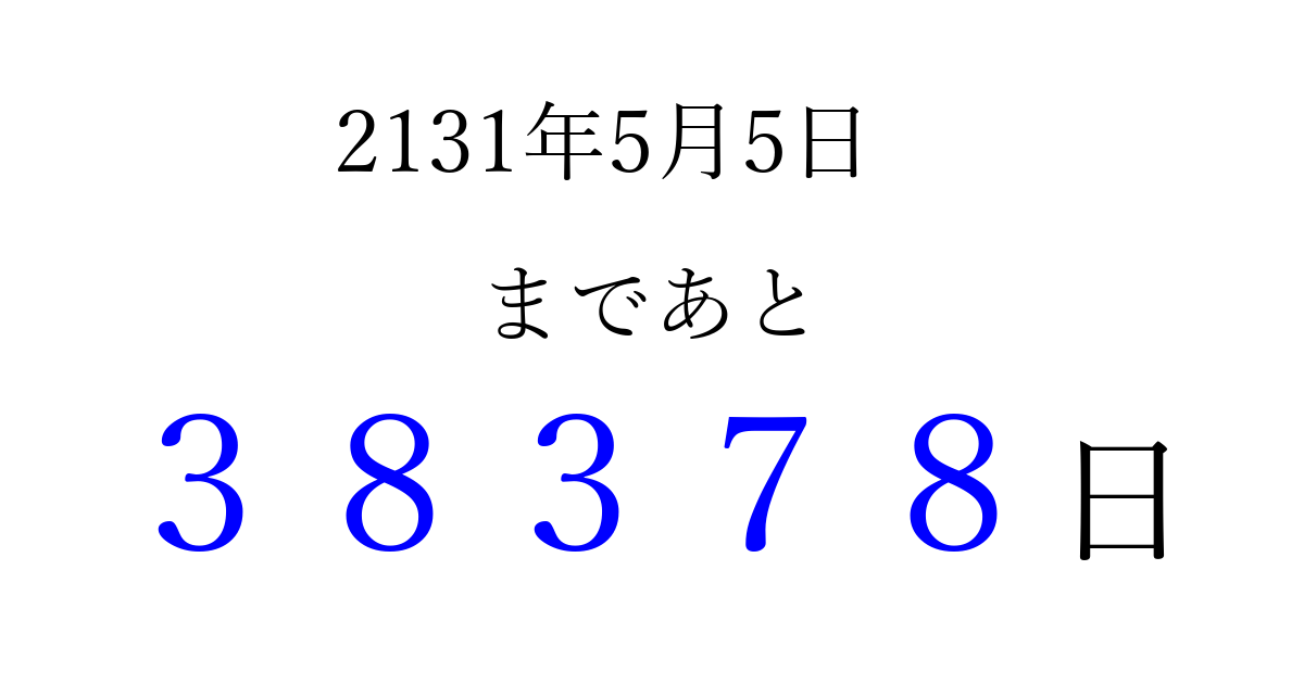2131年5月5日(土)まで あと 99999 日です 追加すると、トップページからすぐ選べるようになります ※2026/04/07現在の結果です。 最新の状態に更新する ↓シェアして、タイムライン上にカウントダウンを表示しよう!↓ 📤 この結果を共有する Tweet シェア Threads Bluesky 別の日付でカウントダウン 2131年5月のカレンダー このページをブックマークに追加すると、いつでもカウントダウンを確認できます。 (PC: Ctrl+D / Mac: ⌘+D) hitome-notes.comでは以下のページも運営しています。 指定日と期間から日付を計算 | ガチャ確率計算・シミュレーション | プライバシー・ポリシー 運営者:Avocado