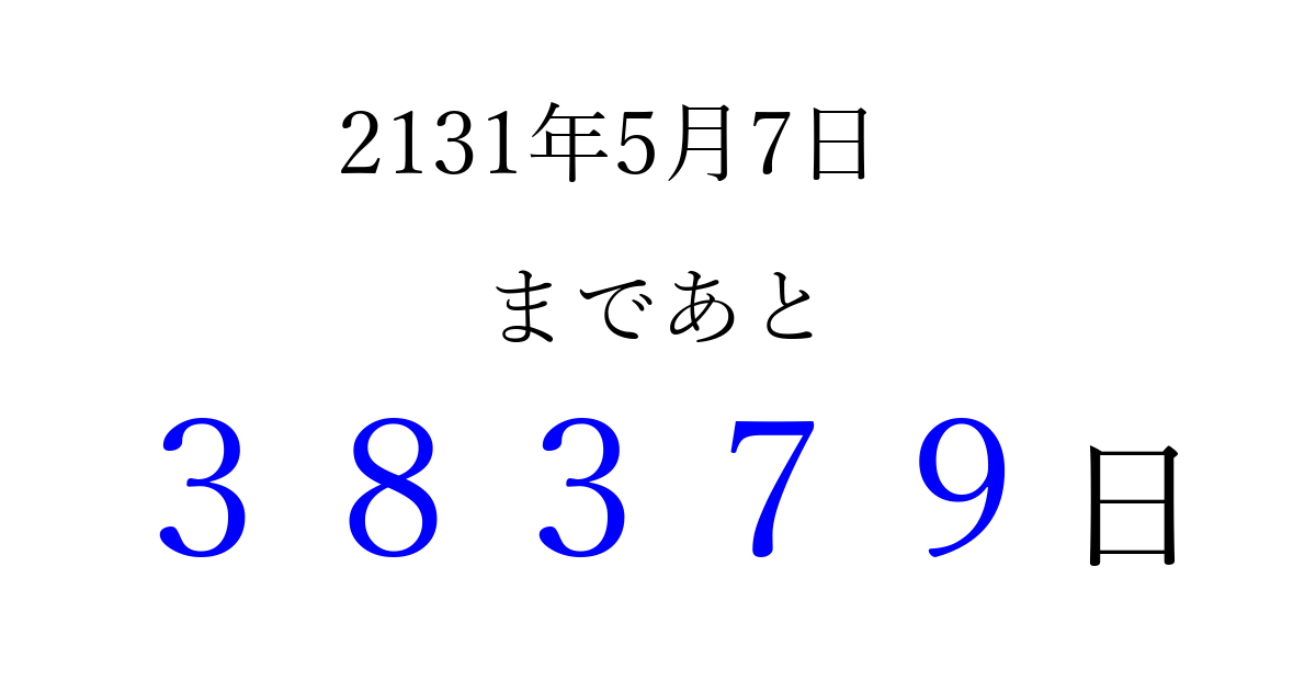 2131年5月7日(月)まで あと 99999 日です 追加すると、トップページからすぐ選べるようになります ※2026/04/08現在の結果です。 最新の状態に更新する ↓シェアして、タイムライン上にカウントダウンを表示しよう!↓ 📤 この結果を共有する Tweet シェア Threads Bluesky 別の日付でカウントダウン 2131年5月のカレンダー このページをブックマークに追加すると、いつでもカウントダウンを確認できます。 (PC: Ctrl+D / Mac: ⌘+D) hitome-notes.comでは以下のページも運営しています。 指定日と期間から日付を計算 | ガチャ確率計算・シミュレーション | プライバシー・ポリシー 運営者:Avocado