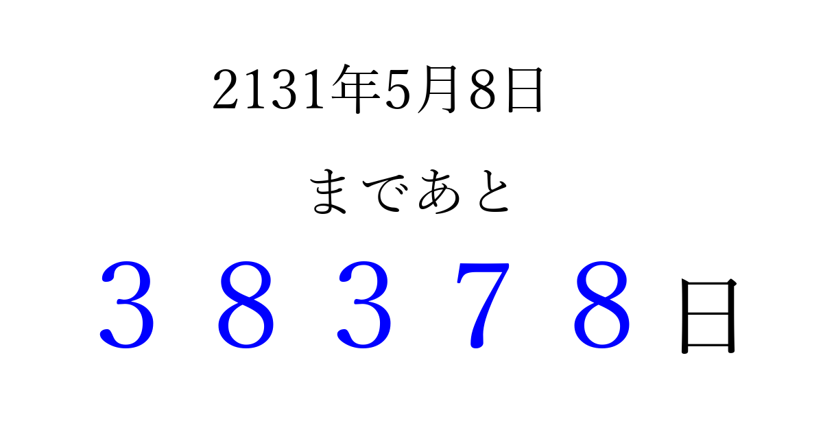 2131年5月8日(火)まで あと 99999 日です 追加すると、トップページからすぐ選べるようになります ※2026/04/10現在の結果です。 最新の状態に更新する ↓シェアして、タイムライン上にカウントダウンを表示しよう!↓ 📤 この結果を共有する Tweet シェア Threads Bluesky 別の日付でカウントダウン 2131年5月のカレンダー このページをブックマークに追加すると、いつでもカウントダウンを確認できます。 (PC: Ctrl+D / Mac: ⌘+D) hitome-notes.comでは以下のページも運営しています。 指定日と期間から日付を計算 | ガチャ確率計算・シミュレーション | プライバシー・ポリシー 運営者:Avocado