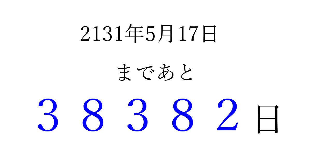 2131年5月17日(木)まで あと 99999 日です 追加すると、トップページからすぐ選べるようになります ※2026/04/15現在の結果です。 最新の状態に更新する ↓シェアして、タイムライン上にカウントダウンを表示しよう!↓ 📤 この結果を共有する Tweet シェア Threads Bluesky 別の日付でカウントダウン 2131年5月のカレンダー このページをブックマークに追加すると、いつでもカウントダウンを確認できます。 (PC: Ctrl+D / Mac: ⌘+D) hitome-notes.comでは以下のページも運営しています。 指定日と期間から日付を計算 | ガチャ確率計算・シミュレーション | プライバシー・ポリシー 運営者:Avocado