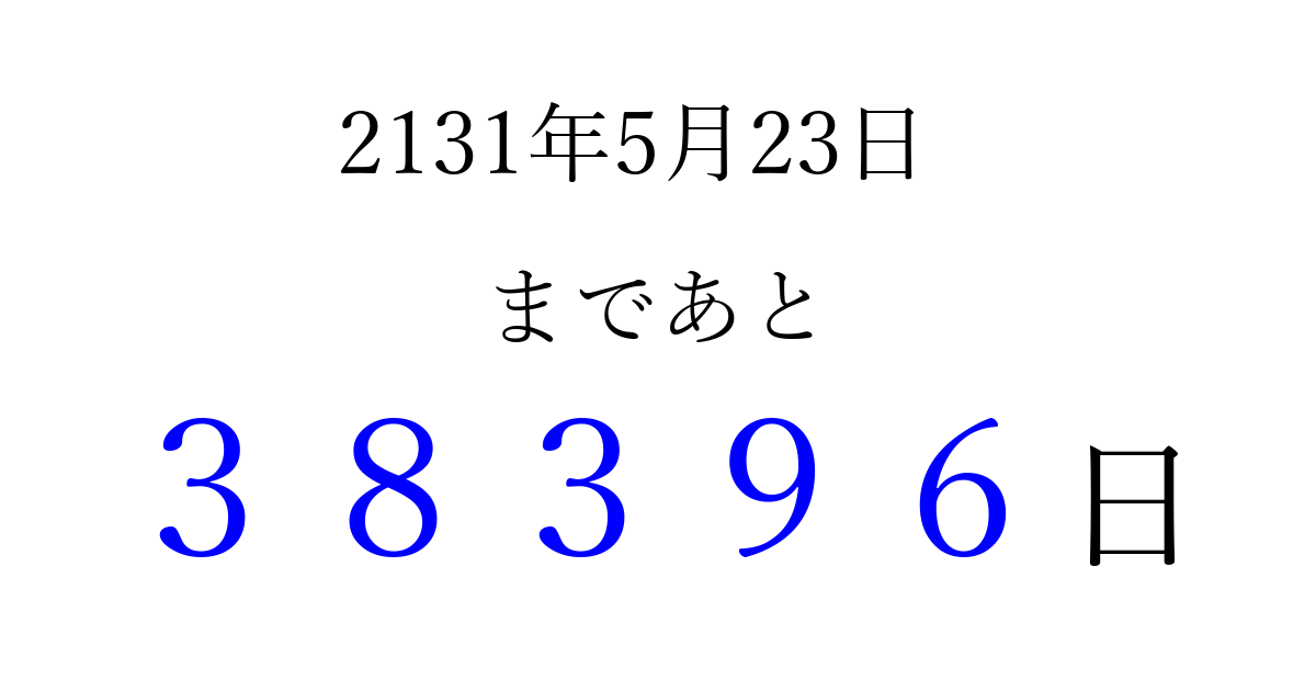 2131年5月23日(水)まで あと 99999 日です 追加すると、トップページからすぐ選べるようになります ※2026/04/07現在の結果です。 最新の状態に更新する ↓シェアして、タイムライン上にカウントダウンを表示しよう!↓ 📤 この結果を共有する Tweet シェア Threads Bluesky 別の日付でカウントダウン 2131年5月のカレンダー このページをブックマークに追加すると、いつでもカウントダウンを確認できます。 (PC: Ctrl+D / Mac: ⌘+D) hitome-notes.comでは以下のページも運営しています。 指定日と期間から日付を計算 | ガチャ確率計算・シミュレーション | プライバシー・ポリシー 運営者:Avocado