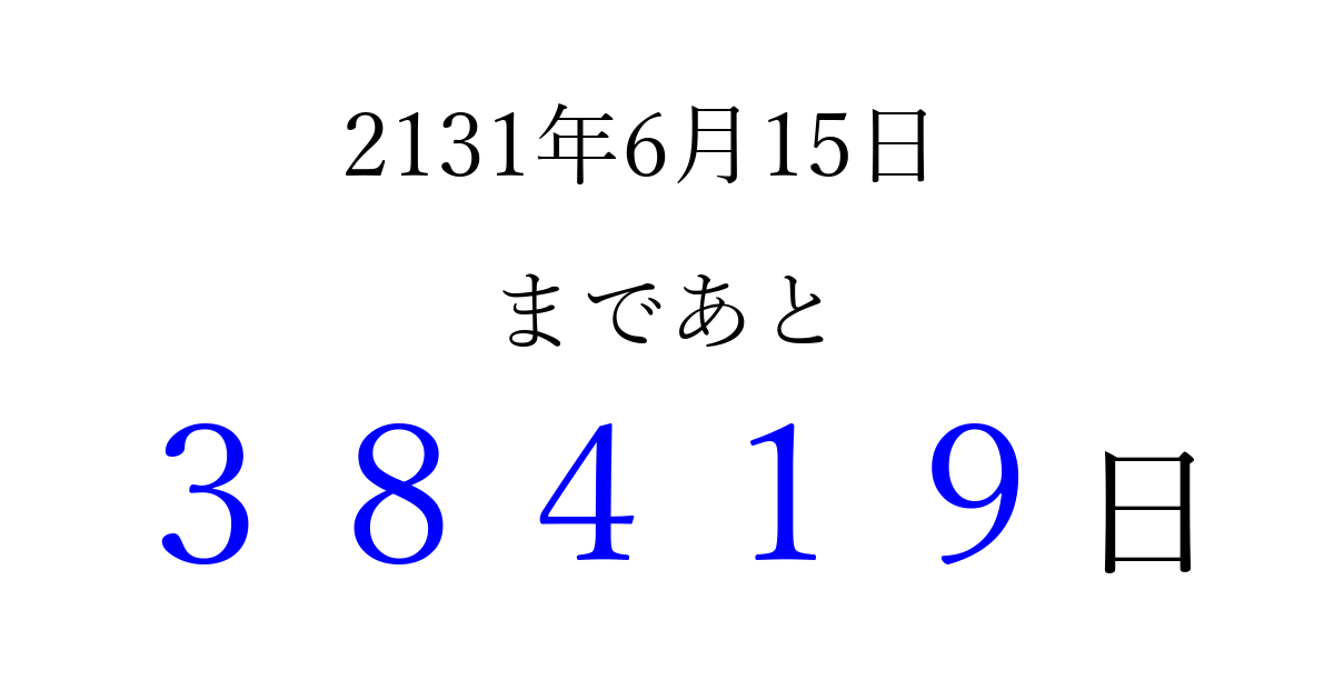 2131年6月15日(金)まで あと 99999 日です 追加すると、トップページからすぐ選べるようになります ※2026/04/07現在の結果です。 最新の状態に更新する ↓シェアして、タイムライン上にカウントダウンを表示しよう!↓ 📤 この結果を共有する Tweet シェア Threads Bluesky 別の日付でカウントダウン 2131年6月のカレンダー このページをブックマークに追加すると、いつでもカウントダウンを確認できます。 (PC: Ctrl+D / Mac: ⌘+D) hitome-notes.comでは以下のページも運営しています。 指定日と期間から日付を計算 | ガチャ確率計算・シミュレーション | プライバシー・ポリシー 運営者:Avocado