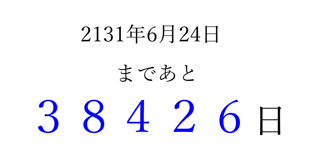 2131年6月24日(日)まで あと 99999 日です 追加すると、トップページからすぐ選べるようになります ※2026/04/09現在の結果です。 最新の状態に更新する ↓シェアして、タイムライン上にカウントダウンを表示しよう!↓ 📤 この結果を共有する Tweet シェア Threads Bluesky 別の日付でカウントダウン 2131年6月のカレンダー このページをブックマークに追加すると、いつでもカウントダウンを確認できます。 (PC: Ctrl+D / Mac: ⌘+D) hitome-notes.comでは以下のページも運営しています。 指定日と期間から日付を計算 | ガチャ確率計算・シミュレーション | プライバシー・ポリシー 運営者:Avocado