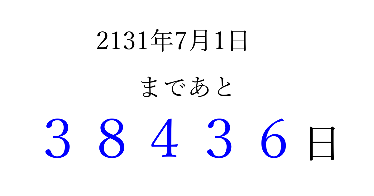 2131年7月1日(日)まで あと 99999 日です 追加すると、トップページからすぐ選べるようになります ※2026/04/06現在の結果です。 最新の状態に更新する ↓シェアして、タイムライン上にカウントダウンを表示しよう!↓ 📤 この結果を共有する Tweet シェア Threads Bluesky 別の日付でカウントダウン 2131年7月のカレンダー このページをブックマークに追加すると、いつでもカウントダウンを確認できます。 (PC: Ctrl+D / Mac: ⌘+D) hitome-notes.comでは以下のページも運営しています。 指定日と期間から日付を計算 | ガチャ確率計算・シミュレーション | プライバシー・ポリシー 運営者:Avocado