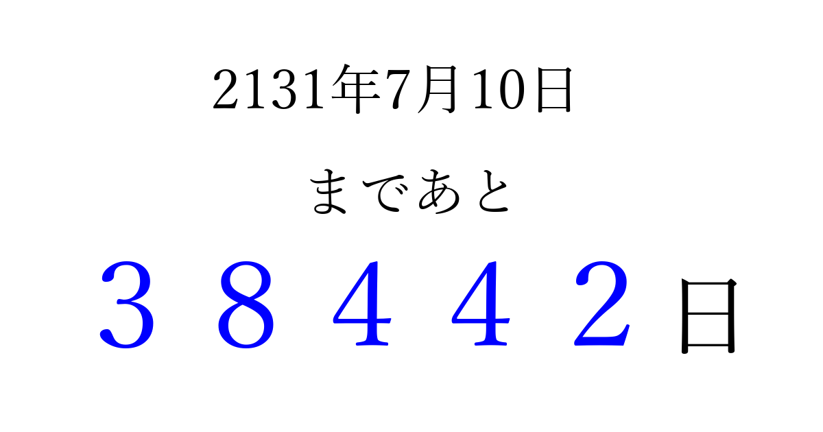 2131年7月10日(火)まで あと 99999 日です 追加すると、トップページからすぐ選べるようになります ※2026/04/09現在の結果です。 最新の状態に更新する ↓シェアして、タイムライン上にカウントダウンを表示しよう!↓ 📤 この結果を共有する Tweet シェア Threads Bluesky 別の日付でカウントダウン 2131年7月のカレンダー このページをブックマークに追加すると、いつでもカウントダウンを確認できます。 (PC: Ctrl+D / Mac: ⌘+D) hitome-notes.comでは以下のページも運営しています。 指定日と期間から日付を計算 | ガチャ確率計算・シミュレーション | プライバシー・ポリシー 運営者:Avocado