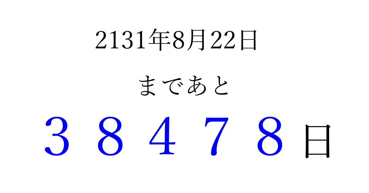 2131年8月22日(水)まで あと 99999 日です 追加すると、トップページからすぐ選べるようになります ※2026/04/16現在の結果です。 最新の状態に更新する ↓シェアして、タイムライン上にカウントダウンを表示しよう!↓ 📤 この結果を共有する Tweet シェア Threads Bluesky 別の日付でカウントダウン 2131年8月のカレンダー このページをブックマークに追加すると、いつでもカウントダウンを確認できます。 (PC: Ctrl+D / Mac: ⌘+D) hitome-notes.comでは以下のページも運営しています。 指定日と期間から日付を計算 | ガチャ確率計算・シミュレーション | プライバシー・ポリシー 運営者:Avocado