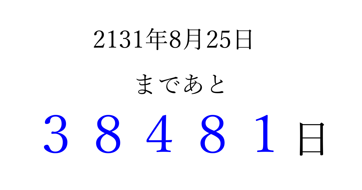 2131年8月25日(土)まで あと 99999 日です 追加すると、トップページからすぐ選べるようになります ※2026/04/16現在の結果です。 最新の状態に更新する ↓シェアして、タイムライン上にカウントダウンを表示しよう!↓ 📤 この結果を共有する Tweet シェア Threads Bluesky 別の日付でカウントダウン 2131年8月のカレンダー このページをブックマークに追加すると、いつでもカウントダウンを確認できます。 (PC: Ctrl+D / Mac: ⌘+D) hitome-notes.comでは以下のページも運営しています。 指定日と期間から日付を計算 | ガチャ確率計算・シミュレーション | プライバシー・ポリシー 運営者:Avocado