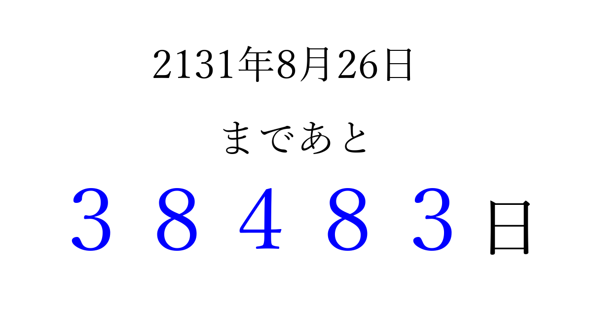 2131年8月26日(日)まで あと 99999 日です 追加すると、トップページからすぐ選べるようになります ※2026/04/15現在の結果です。 最新の状態に更新する ↓シェアして、タイムライン上にカウントダウンを表示しよう!↓ 📤 この結果を共有する Tweet シェア Threads Bluesky 別の日付でカウントダウン 2131年8月のカレンダー このページをブックマークに追加すると、いつでもカウントダウンを確認できます。 (PC: Ctrl+D / Mac: ⌘+D) hitome-notes.comでは以下のページも運営しています。 指定日と期間から日付を計算 | ガチャ確率計算・シミュレーション | プライバシー・ポリシー 運営者:Avocado
