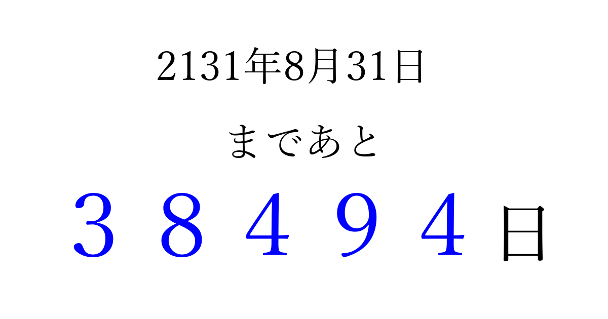 2131年8月31日(金)まで あと 99999 日です 追加すると、トップページからすぐ選べるようになります ※2026/04/09現在の結果です。 最新の状態に更新する ↓シェアして、タイムライン上にカウントダウンを表示しよう!↓ 📤 この結果を共有する Tweet シェア Threads Bluesky 別の日付でカウントダウン 2131年8月のカレンダー このページをブックマークに追加すると、いつでもカウントダウンを確認できます。 (PC: Ctrl+D / Mac: ⌘+D) hitome-notes.comでは以下のページも運営しています。 指定日と期間から日付を計算 | ガチャ確率計算・シミュレーション | プライバシー・ポリシー 運営者:Avocado