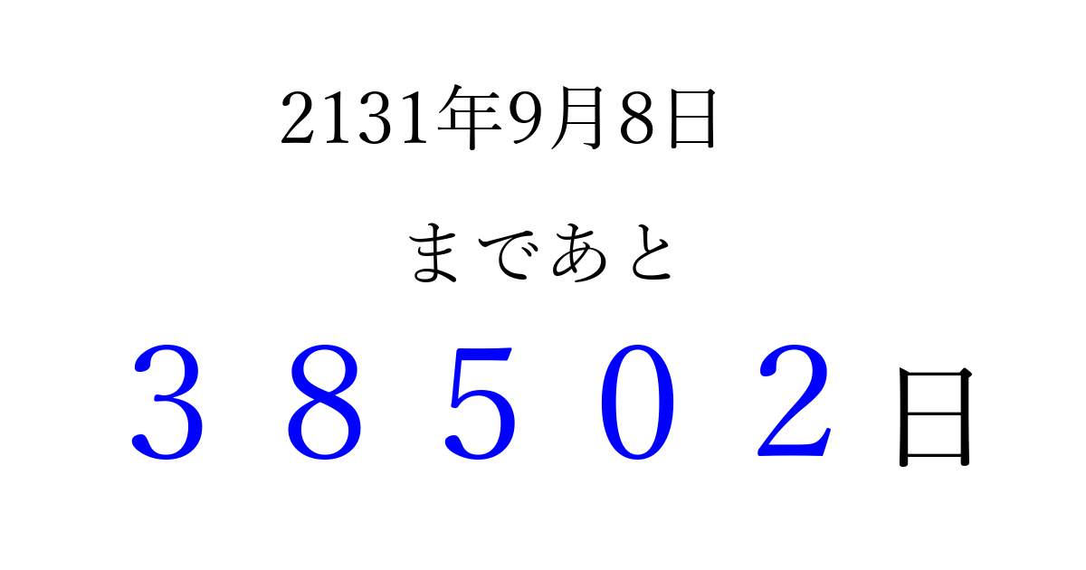 2131年9月8日(土)まで あと 99999 日です 追加すると、トップページからすぐ選べるようになります ※2026/04/09現在の結果です。 最新の状態に更新する ↓シェアして、タイムライン上にカウントダウンを表示しよう!↓ 📤 この結果を共有する Tweet シェア Threads Bluesky 別の日付でカウントダウン 2131年9月のカレンダー このページをブックマークに追加すると、いつでもカウントダウンを確認できます。 (PC: Ctrl+D / Mac: ⌘+D) hitome-notes.comでは以下のページも運営しています。 指定日と期間から日付を計算 | ガチャ確率計算・シミュレーション | プライバシー・ポリシー 運営者:Avocado