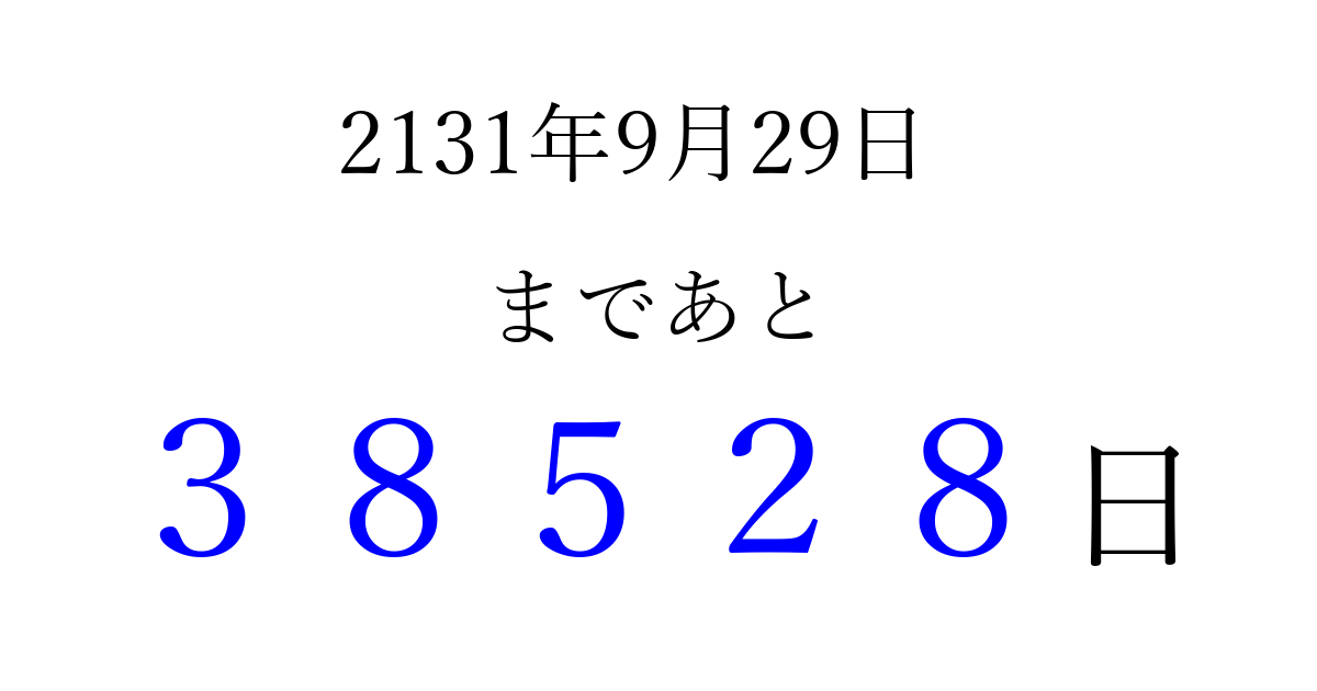 2131年9月29日(土)まで あと 99999 日です 追加すると、トップページからすぐ選べるようになります ※2026/04/04現在の結果です。 最新の状態に更新する ↓シェアして、タイムライン上にカウントダウンを表示しよう!↓ 📤 この結果を共有する Tweet シェア Threads Bluesky 別の日付でカウントダウン 2131年9月のカレンダー このページをブックマークに追加すると、いつでもカウントダウンを確認できます。 (PC: Ctrl+D / Mac: ⌘+D) hitome-notes.comでは以下のページも運営しています。 指定日と期間から日付を計算 | ガチャ確率計算・シミュレーション | プライバシー・ポリシー 運営者:Avocado