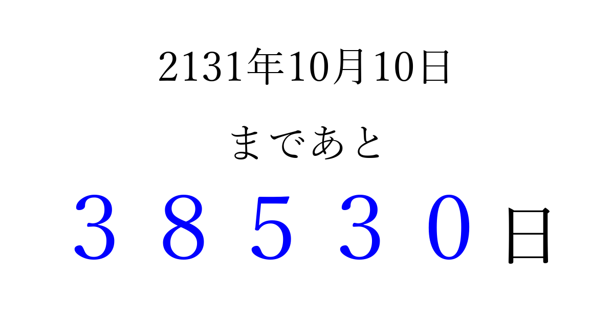 2131年10月10日(水)まで あと 99999 日です 追加すると、トップページからすぐ選べるようになります ※2026/04/13現在の結果です。 最新の状態に更新する ↓シェアして、タイムライン上にカウントダウンを表示しよう!↓ 📤 この結果を共有する Tweet シェア Threads Bluesky 別の日付でカウントダウン 2131年10月のカレンダー このページをブックマークに追加すると、いつでもカウントダウンを確認できます。 (PC: Ctrl+D / Mac: ⌘+D) hitome-notes.comでは以下のページも運営しています。 指定日と期間から日付を計算 | ガチャ確率計算・シミュレーション | プライバシー・ポリシー 運営者:Avocado