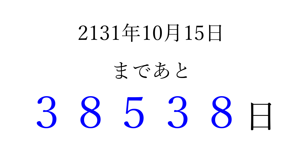 2131年10月15日(月)まで あと 99999 日です 追加すると、トップページからすぐ選べるようになります ※2026/04/10現在の結果です。 最新の状態に更新する ↓シェアして、タイムライン上にカウントダウンを表示しよう!↓ 📤 この結果を共有する Tweet シェア Threads Bluesky 別の日付でカウントダウン 2131年10月のカレンダー このページをブックマークに追加すると、いつでもカウントダウンを確認できます。 (PC: Ctrl+D / Mac: ⌘+D) hitome-notes.comでは以下のページも運営しています。 指定日と期間から日付を計算 | ガチャ確率計算・シミュレーション | プライバシー・ポリシー 運営者:Avocado