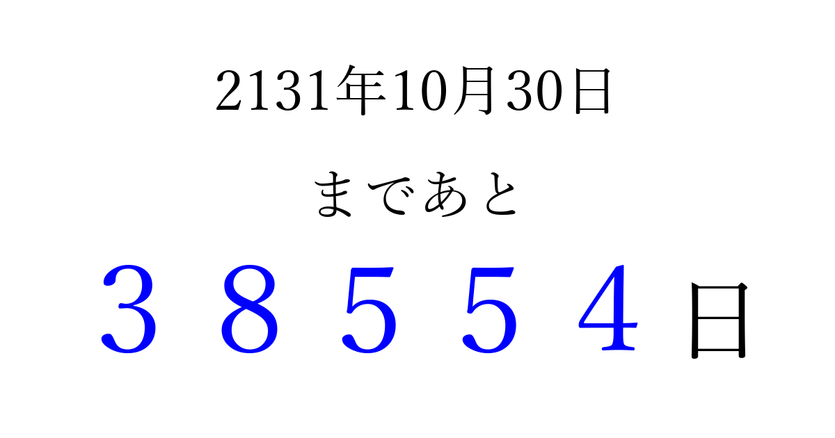 2131年10月30日(火)まで あと 99999 日です 追加すると、トップページからすぐ選べるようになります ※2026/04/09現在の結果です。 最新の状態に更新する ↓シェアして、タイムライン上にカウントダウンを表示しよう!↓ 📤 この結果を共有する Tweet シェア Threads Bluesky 別の日付でカウントダウン 2131年10月のカレンダー このページをブックマークに追加すると、いつでもカウントダウンを確認できます。 (PC: Ctrl+D / Mac: ⌘+D) hitome-notes.comでは以下のページも運営しています。 指定日と期間から日付を計算 | ガチャ確率計算・シミュレーション | プライバシー・ポリシー 運営者:Avocado