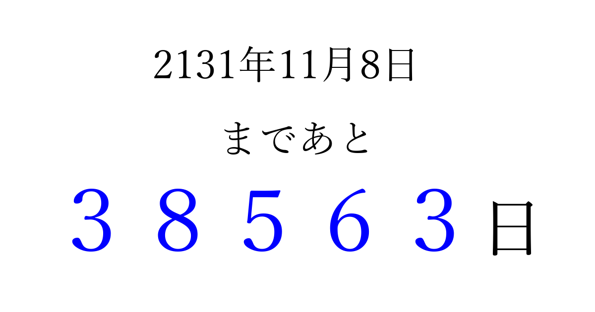 2131年11月8日(木)まで あと 99999 日です 追加すると、トップページからすぐ選べるようになります ※2026/04/09現在の結果です。 最新の状態に更新する ↓シェアして、タイムライン上にカウントダウンを表示しよう!↓ 📤 この結果を共有する Tweet シェア Threads Bluesky 別の日付でカウントダウン 2131年11月のカレンダー このページをブックマークに追加すると、いつでもカウントダウンを確認できます。 (PC: Ctrl+D / Mac: ⌘+D) hitome-notes.comでは以下のページも運営しています。 指定日と期間から日付を計算 | ガチャ確率計算・シミュレーション | プライバシー・ポリシー 運営者:Avocado