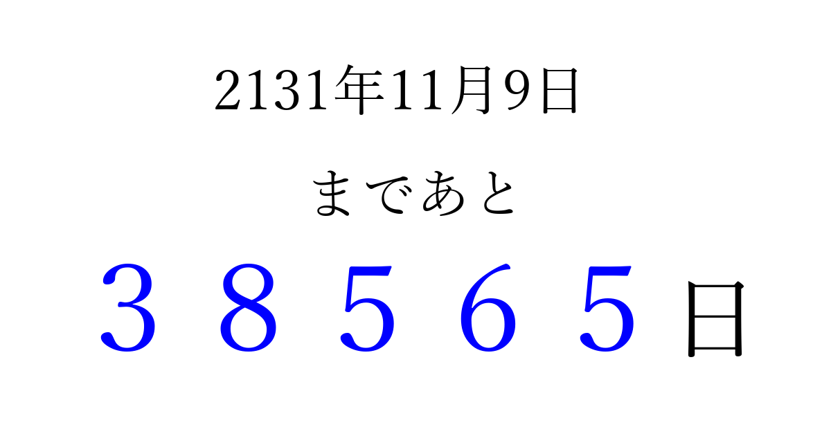 2131年11月9日(金)まで あと 99999 日です 追加すると、トップページからすぐ選べるようになります ※2026/04/08現在の結果です。 最新の状態に更新する ↓シェアして、タイムライン上にカウントダウンを表示しよう!↓ 📤 この結果を共有する Tweet シェア Threads Bluesky 別の日付でカウントダウン 2131年11月のカレンダー このページをブックマークに追加すると、いつでもカウントダウンを確認できます。 (PC: Ctrl+D / Mac: ⌘+D) hitome-notes.comでは以下のページも運営しています。 指定日と期間から日付を計算 | ガチャ確率計算・シミュレーション | プライバシー・ポリシー 運営者:Avocado