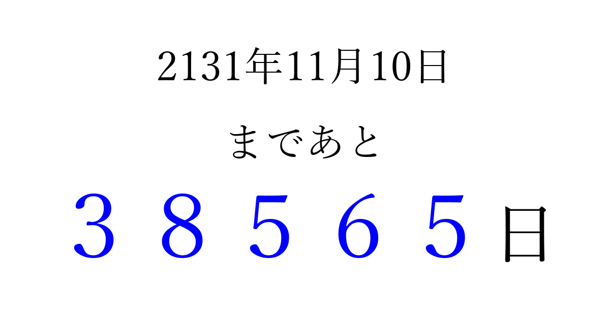 2131年11月10日(土)まで あと 99999 日です 追加すると、トップページからすぐ選べるようになります ※2026/04/09現在の結果です。 最新の状態に更新する ↓シェアして、タイムライン上にカウントダウンを表示しよう!↓ 📤 この結果を共有する Tweet シェア Threads Bluesky 別の日付でカウントダウン 2131年11月のカレンダー このページをブックマークに追加すると、いつでもカウントダウンを確認できます。 (PC: Ctrl+D / Mac: ⌘+D) hitome-notes.comでは以下のページも運営しています。 指定日と期間から日付を計算 | ガチャ確率計算・シミュレーション | プライバシー・ポリシー 運営者:Avocado
