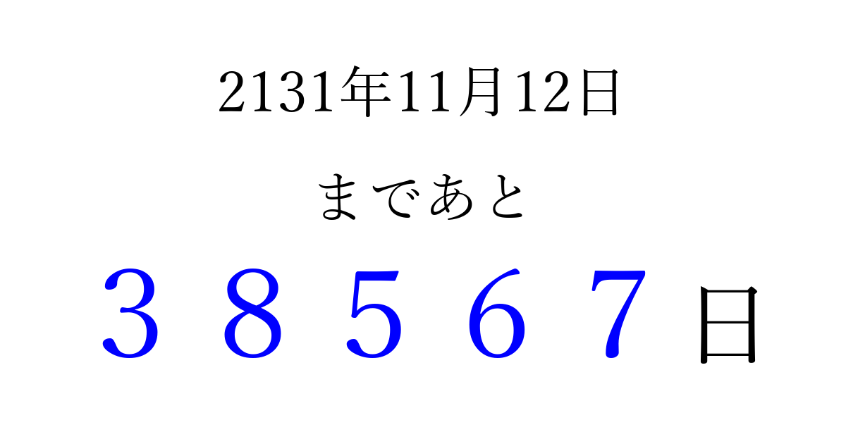 2131年11月12日(月)まで あと 99999 日です 追加すると、トップページからすぐ選べるようになります ※2026/04/09現在の結果です。 最新の状態に更新する ↓シェアして、タイムライン上にカウントダウンを表示しよう!↓ 📤 この結果を共有する Tweet シェア Threads Bluesky 別の日付でカウントダウン 2131年11月のカレンダー このページをブックマークに追加すると、いつでもカウントダウンを確認できます。 (PC: Ctrl+D / Mac: ⌘+D) hitome-notes.comでは以下のページも運営しています。 指定日と期間から日付を計算 | ガチャ確率計算・シミュレーション | プライバシー・ポリシー 運営者:Avocado