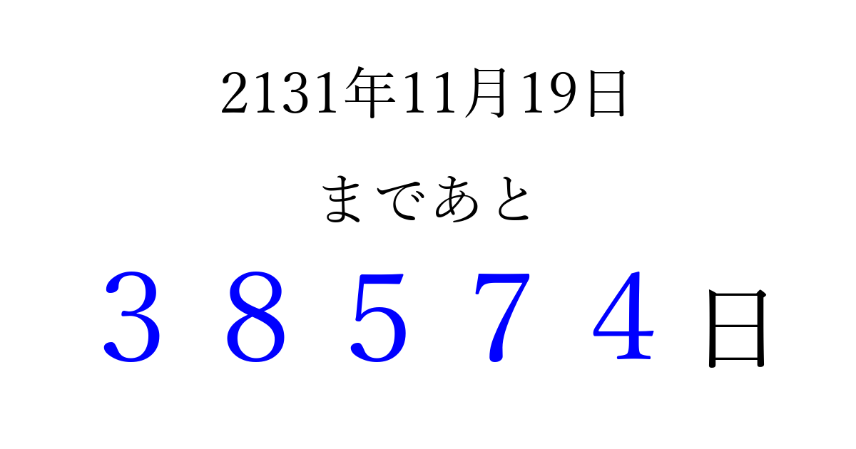2131年11月19日(月)まで あと 99999 日です 追加すると、トップページからすぐ選べるようになります ※2026/04/09現在の結果です。 最新の状態に更新する ↓シェアして、タイムライン上にカウントダウンを表示しよう!↓ 📤 この結果を共有する Tweet シェア Threads Bluesky 別の日付でカウントダウン 2131年11月のカレンダー このページをブックマークに追加すると、いつでもカウントダウンを確認できます。 (PC: Ctrl+D / Mac: ⌘+D) hitome-notes.comでは以下のページも運営しています。 指定日と期間から日付を計算 | ガチャ確率計算・シミュレーション | プライバシー・ポリシー 運営者:Avocado