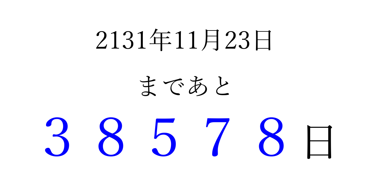 2131年11月23日(金)まで あと 99999 日です 追加すると、トップページからすぐ選べるようになります ※2026/04/09現在の結果です。 最新の状態に更新する ↓シェアして、タイムライン上にカウントダウンを表示しよう!↓ 📤 この結果を共有する Tweet シェア Threads Bluesky 別の日付でカウントダウン 2131年11月のカレンダー このページをブックマークに追加すると、いつでもカウントダウンを確認できます。 (PC: Ctrl+D / Mac: ⌘+D) hitome-notes.comでは以下のページも運営しています。 指定日と期間から日付を計算 | ガチャ確率計算・シミュレーション | プライバシー・ポリシー 運営者:Avocado