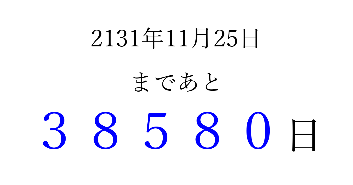 2131年11月25日(日)まで あと 99999 日です 追加すると、トップページからすぐ選べるようになります ※2026/04/09現在の結果です。 最新の状態に更新する ↓シェアして、タイムライン上にカウントダウンを表示しよう!↓ 📤 この結果を共有する Tweet シェア Threads Bluesky 別の日付でカウントダウン 2131年11月のカレンダー このページをブックマークに追加すると、いつでもカウントダウンを確認できます。 (PC: Ctrl+D / Mac: ⌘+D) hitome-notes.comでは以下のページも運営しています。 指定日と期間から日付を計算 | ガチャ確率計算・シミュレーション | プライバシー・ポリシー 運営者:Avocado