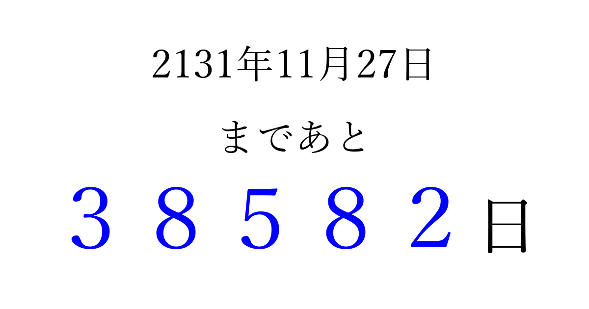 2131年11月27日(火)まで あと 99999 日です 追加すると、トップページからすぐ選べるようになります ※2026/04/09現在の結果です。 最新の状態に更新する ↓シェアして、タイムライン上にカウントダウンを表示しよう!↓ 📤 この結果を共有する Tweet シェア Threads Bluesky 別の日付でカウントダウン 2131年11月のカレンダー このページをブックマークに追加すると、いつでもカウントダウンを確認できます。 (PC: Ctrl+D / Mac: ⌘+D) hitome-notes.comでは以下のページも運営しています。 指定日と期間から日付を計算 | ガチャ確率計算・シミュレーション | プライバシー・ポリシー 運営者:Avocado