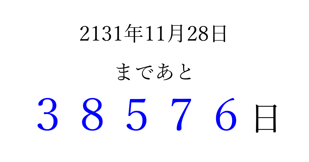 2131年11月28日(水)まで あと 99999 日です 追加すると、トップページからすぐ選べるようになります ※2026/04/16現在の結果です。 最新の状態に更新する ↓シェアして、タイムライン上にカウントダウンを表示しよう!↓ 📤 この結果を共有する Tweet シェア Threads Bluesky 別の日付でカウントダウン 2131年11月のカレンダー このページをブックマークに追加すると、いつでもカウントダウンを確認できます。 (PC: Ctrl+D / Mac: ⌘+D) hitome-notes.comでは以下のページも運営しています。 指定日と期間から日付を計算 | ガチャ確率計算・シミュレーション | プライバシー・ポリシー 運営者:Avocado