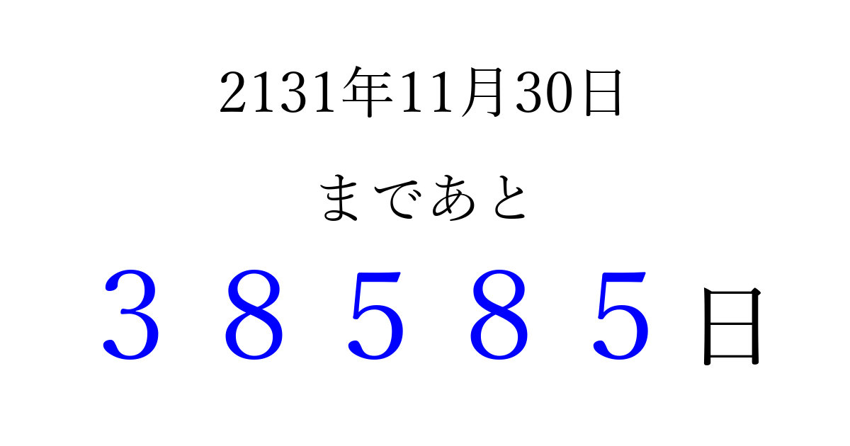 2131年11月30日(金)まで あと 99999 日です 追加すると、トップページからすぐ選べるようになります ※2026/04/09現在の結果です。 最新の状態に更新する ↓シェアして、タイムライン上にカウントダウンを表示しよう!↓ 📤 この結果を共有する Tweet シェア Threads Bluesky 別の日付でカウントダウン 2131年11月のカレンダー このページをブックマークに追加すると、いつでもカウントダウンを確認できます。 (PC: Ctrl+D / Mac: ⌘+D) hitome-notes.comでは以下のページも運営しています。 指定日と期間から日付を計算 | ガチャ確率計算・シミュレーション | プライバシー・ポリシー 運営者:Avocado