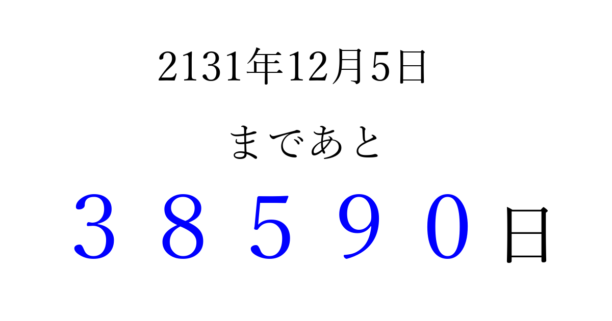 2131年12月5日(水)まで あと 99999 日です 追加すると、トップページからすぐ選べるようになります ※2026/04/09現在の結果です。 最新の状態に更新する ↓シェアして、タイムライン上にカウントダウンを表示しよう!↓ 📤 この結果を共有する Tweet シェア Threads Bluesky 別の日付でカウントダウン 2131年12月のカレンダー このページをブックマークに追加すると、いつでもカウントダウンを確認できます。 (PC: Ctrl+D / Mac: ⌘+D) hitome-notes.comでは以下のページも運営しています。 指定日と期間から日付を計算 | ガチャ確率計算・シミュレーション | プライバシー・ポリシー 運営者:Avocado