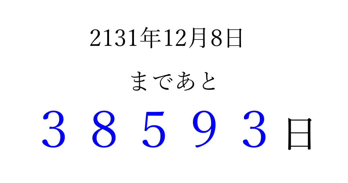 2131年12月8日(土)まで あと 99999 日です 追加すると、トップページからすぐ選べるようになります ※2026/04/09現在の結果です。 最新の状態に更新する ↓シェアして、タイムライン上にカウントダウンを表示しよう!↓ 📤 この結果を共有する Tweet シェア Threads Bluesky 別の日付でカウントダウン 2131年12月のカレンダー このページをブックマークに追加すると、いつでもカウントダウンを確認できます。 (PC: Ctrl+D / Mac: ⌘+D) hitome-notes.comでは以下のページも運営しています。 指定日と期間から日付を計算 | ガチャ確率計算・シミュレーション | プライバシー・ポリシー 運営者:Avocado