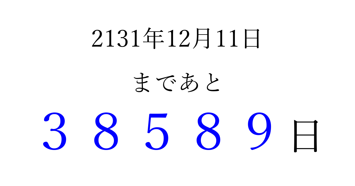 2131年12月11日(火)まで あと 99999 日です 追加すると、トップページからすぐ選べるようになります ※2026/04/16現在の結果です。 最新の状態に更新する ↓シェアして、タイムライン上にカウントダウンを表示しよう!↓ 📤 この結果を共有する Tweet シェア Threads Bluesky 別の日付でカウントダウン 2131年12月のカレンダー このページをブックマークに追加すると、いつでもカウントダウンを確認できます。 (PC: Ctrl+D / Mac: ⌘+D) hitome-notes.comでは以下のページも運営しています。 指定日と期間から日付を計算 | ガチャ確率計算・シミュレーション | プライバシー・ポリシー 運営者:Avocado