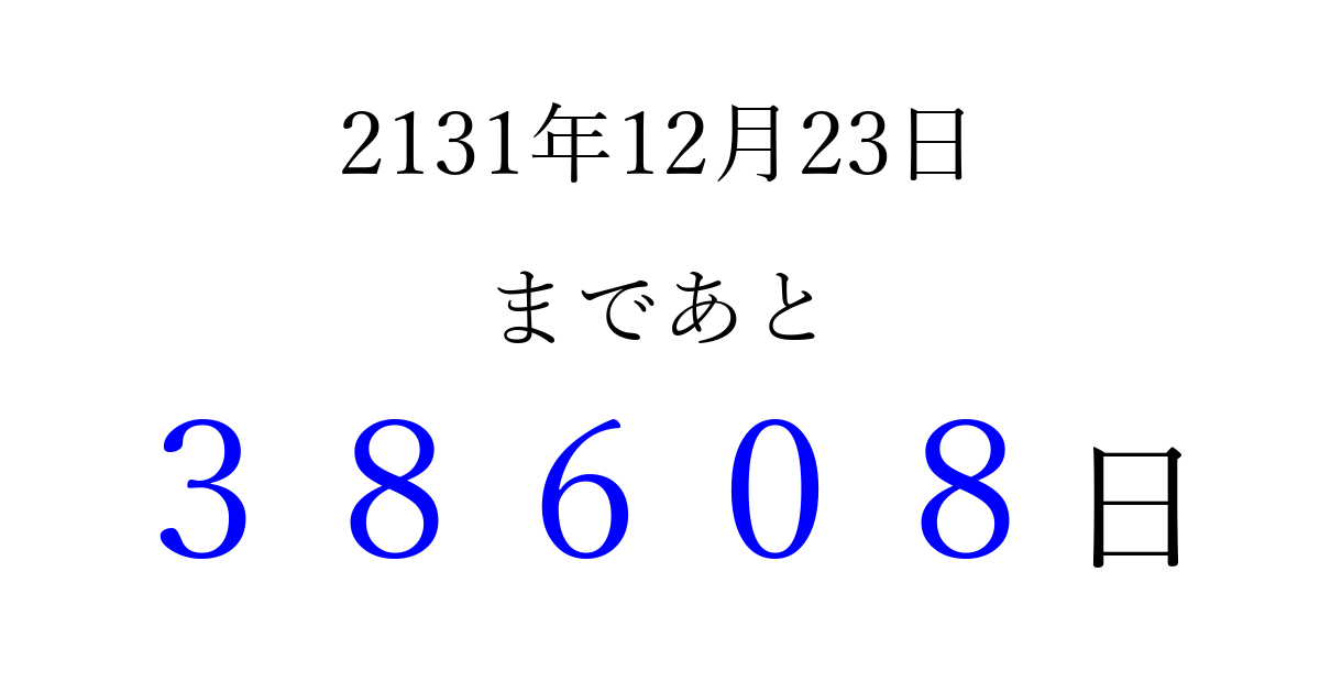 2131年12月23日(日)まで あと 99999 日です 追加すると、トップページからすぐ選べるようになります ※2026/04/09現在の結果です。 最新の状態に更新する ↓シェアして、タイムライン上にカウントダウンを表示しよう!↓ 📤 この結果を共有する Tweet シェア Threads Bluesky 別の日付でカウントダウン 2131年12月のカレンダー このページをブックマークに追加すると、いつでもカウントダウンを確認できます。 (PC: Ctrl+D / Mac: ⌘+D) hitome-notes.comでは以下のページも運営しています。 指定日と期間から日付を計算 | ガチャ確率計算・シミュレーション | プライバシー・ポリシー 運営者:Avocado