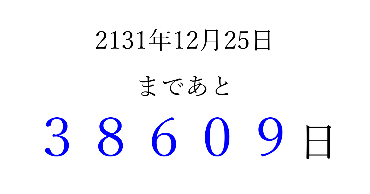 2131年12月25日(火)まで あと 99999 日です 追加すると、トップページからすぐ選べるようになります ※2026/04/10現在の結果です。 最新の状態に更新する ↓シェアして、タイムライン上にカウントダウンを表示しよう!↓ 📤 この結果を共有する Tweet シェア Threads Bluesky 別の日付でカウントダウン 2131年12月のカレンダー このページをブックマークに追加すると、いつでもカウントダウンを確認できます。 (PC: Ctrl+D / Mac: ⌘+D) hitome-notes.comでは以下のページも運営しています。 指定日と期間から日付を計算 | ガチャ確率計算・シミュレーション | プライバシー・ポリシー 運営者:Avocado
