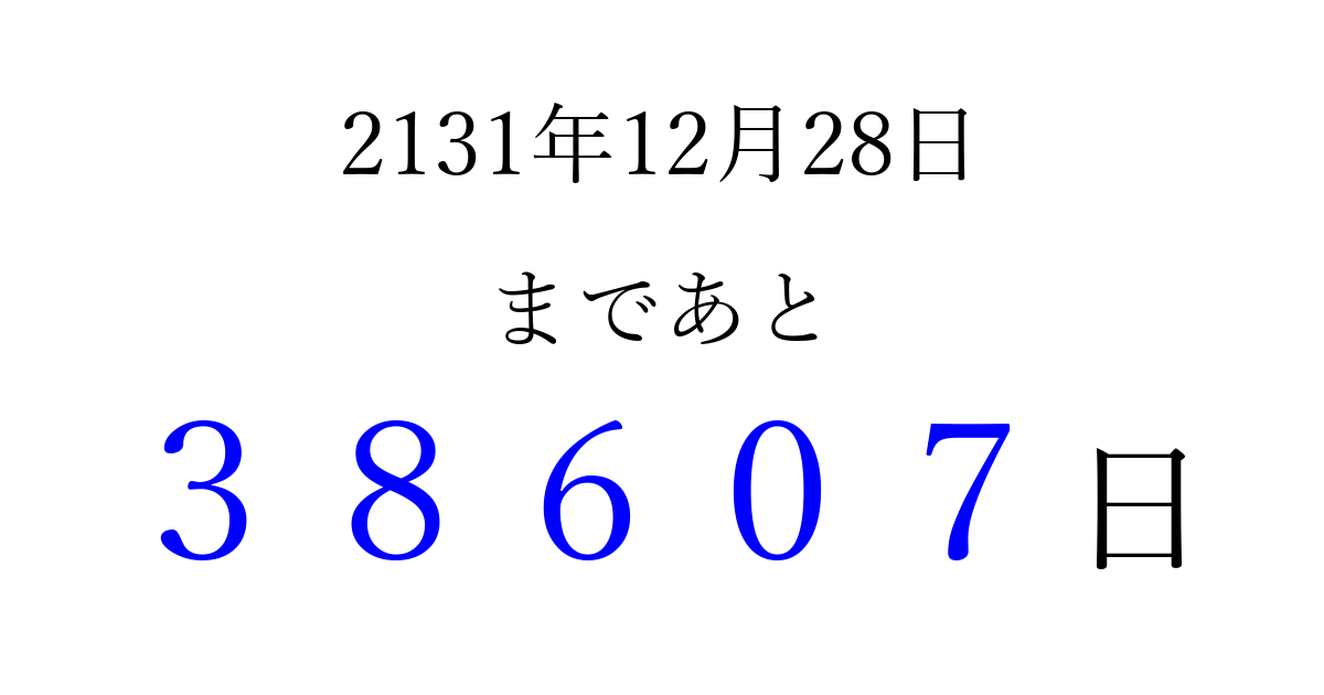 2131年12月28日(金)まで あと 99999 日です 追加すると、トップページからすぐ選べるようになります ※2026/04/15現在の結果です。 最新の状態に更新する ↓シェアして、タイムライン上にカウントダウンを表示しよう!↓ 📤 この結果を共有する Tweet シェア Threads Bluesky 別の日付でカウントダウン 2131年12月のカレンダー このページをブックマークに追加すると、いつでもカウントダウンを確認できます。 (PC: Ctrl+D / Mac: ⌘+D) hitome-notes.comでは以下のページも運営しています。 指定日と期間から日付を計算 | ガチャ確率計算・シミュレーション | プライバシー・ポリシー 運営者:Avocado