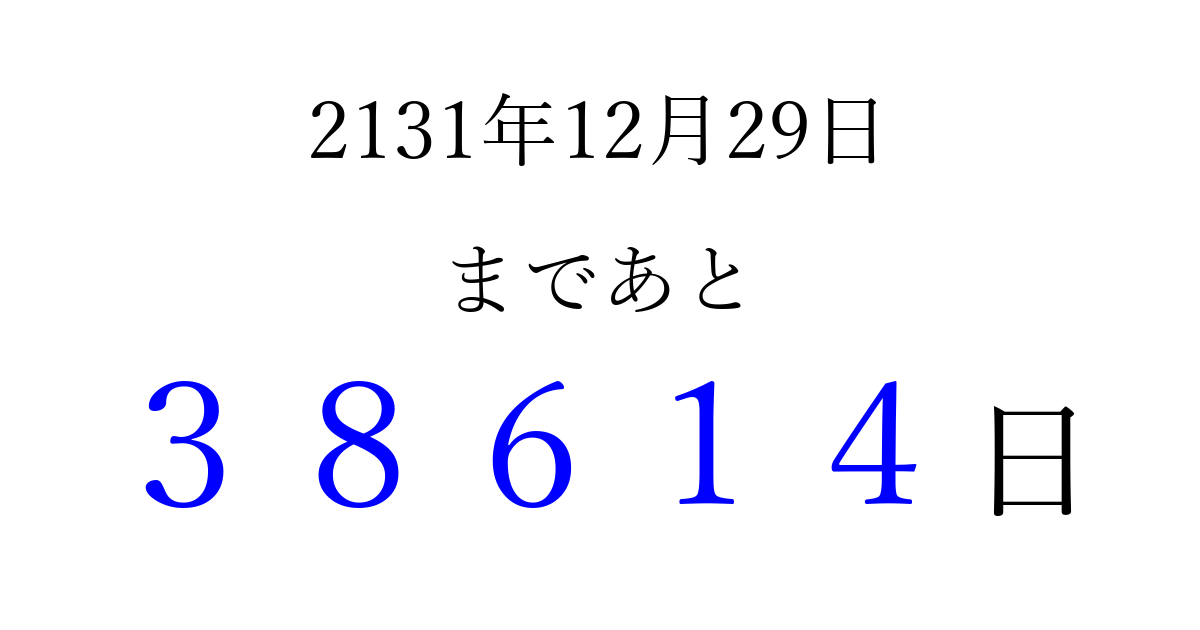 2131年12月29日(土)まで あと 99999 日です 追加すると、トップページからすぐ選べるようになります ※2026/04/09現在の結果です。 最新の状態に更新する ↓シェアして、タイムライン上にカウントダウンを表示しよう!↓ 📤 この結果を共有する Tweet シェア Threads Bluesky 別の日付でカウントダウン 2131年12月のカレンダー このページをブックマークに追加すると、いつでもカウントダウンを確認できます。 (PC: Ctrl+D / Mac: ⌘+D) hitome-notes.comでは以下のページも運営しています。 指定日と期間から日付を計算 | ガチャ確率計算・シミュレーション | プライバシー・ポリシー 運営者:Avocado