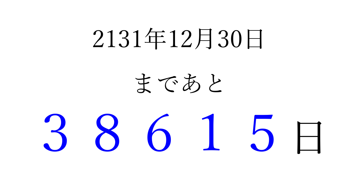 2131年12月30日(日)まで あと 99999 日です 追加すると、トップページからすぐ選べるようになります ※2026/04/09現在の結果です。 最新の状態に更新する ↓シェアして、タイムライン上にカウントダウンを表示しよう!↓ 📤 この結果を共有する Tweet シェア Threads Bluesky 別の日付でカウントダウン 2131年12月のカレンダー このページをブックマークに追加すると、いつでもカウントダウンを確認できます。 (PC: Ctrl+D / Mac: ⌘+D) hitome-notes.comでは以下のページも運営しています。 指定日と期間から日付を計算 | ガチャ確率計算・シミュレーション | プライバシー・ポリシー 運営者:Avocado