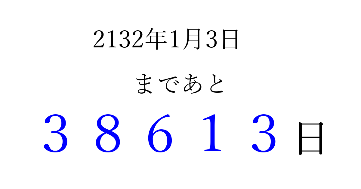 2132年1月3日(木)まで あと 99999 日です 追加すると、トップページからすぐ選べるようになります ※2026/04/15現在の結果です。 最新の状態に更新する ↓シェアして、タイムライン上にカウントダウンを表示しよう!↓ 📤 この結果を共有する Tweet シェア Threads Bluesky 別の日付でカウントダウン 2132年1月のカレンダー このページをブックマークに追加すると、いつでもカウントダウンを確認できます。 (PC: Ctrl+D / Mac: ⌘+D) hitome-notes.comでは以下のページも運営しています。 指定日と期間から日付を計算 | ガチャ確率計算・シミュレーション | プライバシー・ポリシー 運営者:Avocado