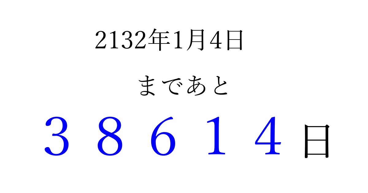 2132年1月4日(金)まで あと 99999 日です 追加すると、トップページからすぐ選べるようになります ※2026/04/15現在の結果です。 最新の状態に更新する ↓シェアして、タイムライン上にカウントダウンを表示しよう!↓ 📤 この結果を共有する Tweet シェア Threads Bluesky 別の日付でカウントダウン 2132年1月のカレンダー このページをブックマークに追加すると、いつでもカウントダウンを確認できます。 (PC: Ctrl+D / Mac: ⌘+D) hitome-notes.comでは以下のページも運営しています。 指定日と期間から日付を計算 | ガチャ確率計算・シミュレーション | プライバシー・ポリシー 運営者:Avocado