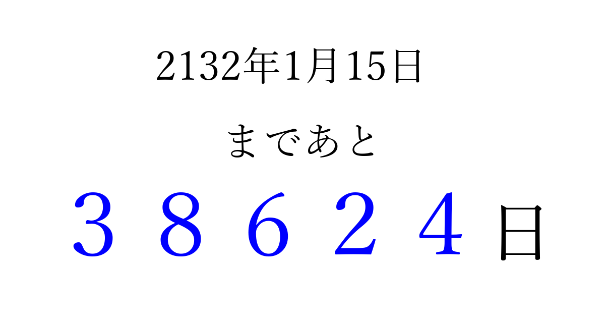 2132年1月15日(火)まで あと 99999 日です 追加すると、トップページからすぐ選べるようになります ※2026/04/16現在の結果です。 最新の状態に更新する ↓シェアして、タイムライン上にカウントダウンを表示しよう!↓ 📤 この結果を共有する Tweet シェア Threads Bluesky 別の日付でカウントダウン 2132年1月のカレンダー このページをブックマークに追加すると、いつでもカウントダウンを確認できます。 (PC: Ctrl+D / Mac: ⌘+D) hitome-notes.comでは以下のページも運営しています。 指定日と期間から日付を計算 | ガチャ確率計算・シミュレーション | プライバシー・ポリシー 運営者:Avocado
