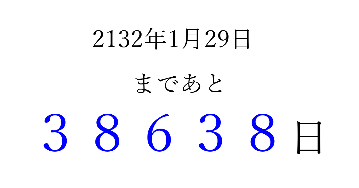 2132年1月29日(火)まで あと 99999 日です 追加すると、トップページからすぐ選べるようになります ※2026/04/16現在の結果です。 最新の状態に更新する ↓シェアして、タイムライン上にカウントダウンを表示しよう!↓ 📤 この結果を共有する Tweet シェア Threads Bluesky 別の日付でカウントダウン 2132年1月のカレンダー このページをブックマークに追加すると、いつでもカウントダウンを確認できます。 (PC: Ctrl+D / Mac: ⌘+D) hitome-notes.comでは以下のページも運営しています。 指定日と期間から日付を計算 | ガチャ確率計算・シミュレーション | プライバシー・ポリシー 運営者:Avocado