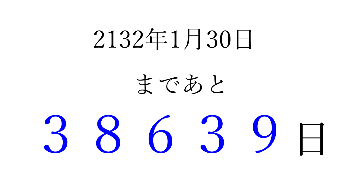 2132年1月30日(水)まで あと 99999 日です 追加すると、トップページからすぐ選べるようになります ※2026/04/16現在の結果です。 最新の状態に更新する ↓シェアして、タイムライン上にカウントダウンを表示しよう!↓ 📤 この結果を共有する Tweet シェア Threads Bluesky 別の日付でカウントダウン 2132年1月のカレンダー このページをブックマークに追加すると、いつでもカウントダウンを確認できます。 (PC: Ctrl+D / Mac: ⌘+D) hitome-notes.comでは以下のページも運営しています。 指定日と期間から日付を計算 | ガチャ確率計算・シミュレーション | プライバシー・ポリシー 運営者:Avocado